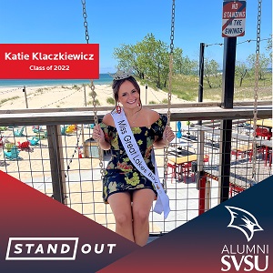 Katie Klaczkiewicz is Miss Great Lakes Bay and a 2022 SVSU alum. She graduated with a degree in Social Work and works with teenagers at Westlund Guidance Clinic. She loves her job and is passionate about children’s mental health. She even organizes an annual walk to benefit counselors in local elementary to make sure the children get the resources they need.