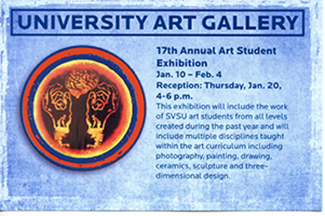 The Annual SVSU Art Student Show features works from all media offered by the SVSU Art Department. Students who have created work in Department classes during the previous academic year are welcome to apply by downloading the pdf highlighted Annual Student Show Entry Form (461KB) and exhibit in this show. This show happens annually, and has been moved from the Spring semester to the Winter semester.