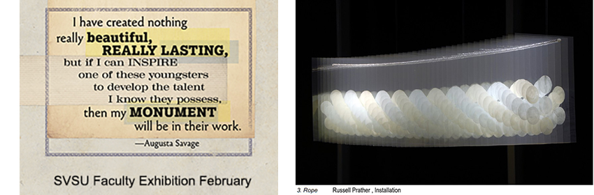 The University Art Gallery will visually inspire visitors with frequently changing exhibitions that display a wide variety of contemporary art styles and media from international artists and SVSU Art Department students. Located in the Arbury Fine Arts Center, the gallery is intended as a cultural resource for our students and the surrounding regional community. The gallery has a large, well-lit viewing space and all exhibitions, lectures, and receptions are free and open to the public. For further information regarding exhibitions, open hours, and how to exhibit in our space, please navigate the appropriate links on the sidebar to the left.