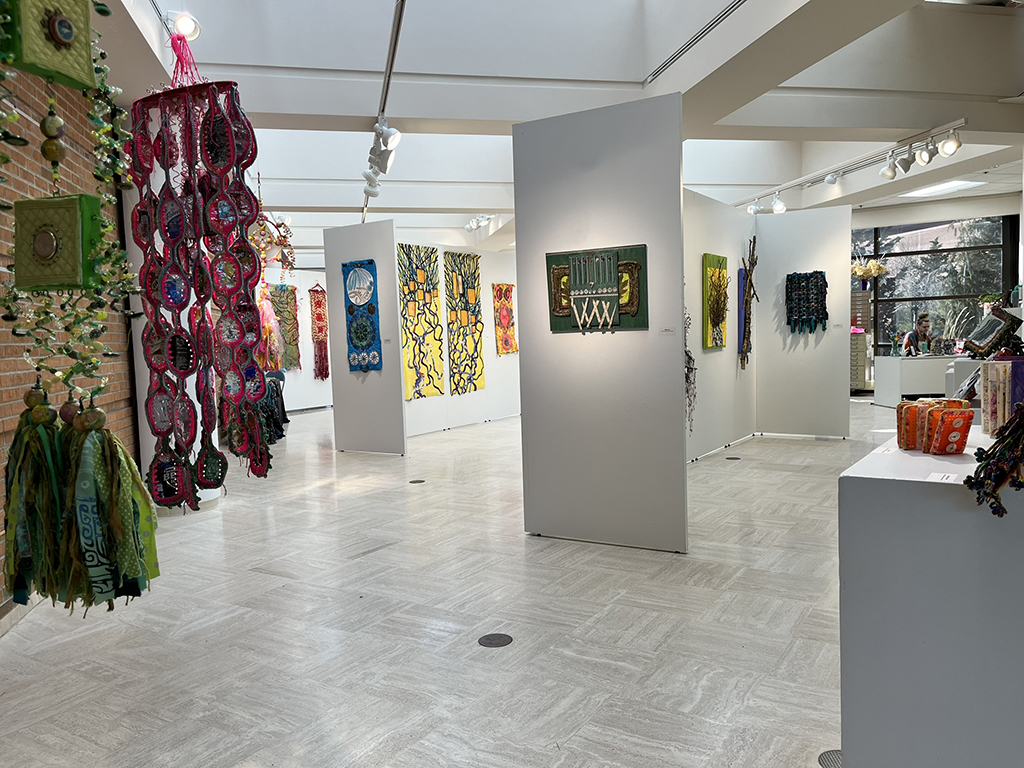 The viewer can enjoy the colorful layers of pattern, texture and shape in her work. The raw and rough edges convey spontaneity and an exuberant process. Lastly, the art suggests stories, memories or personal associations to each individual viewer.