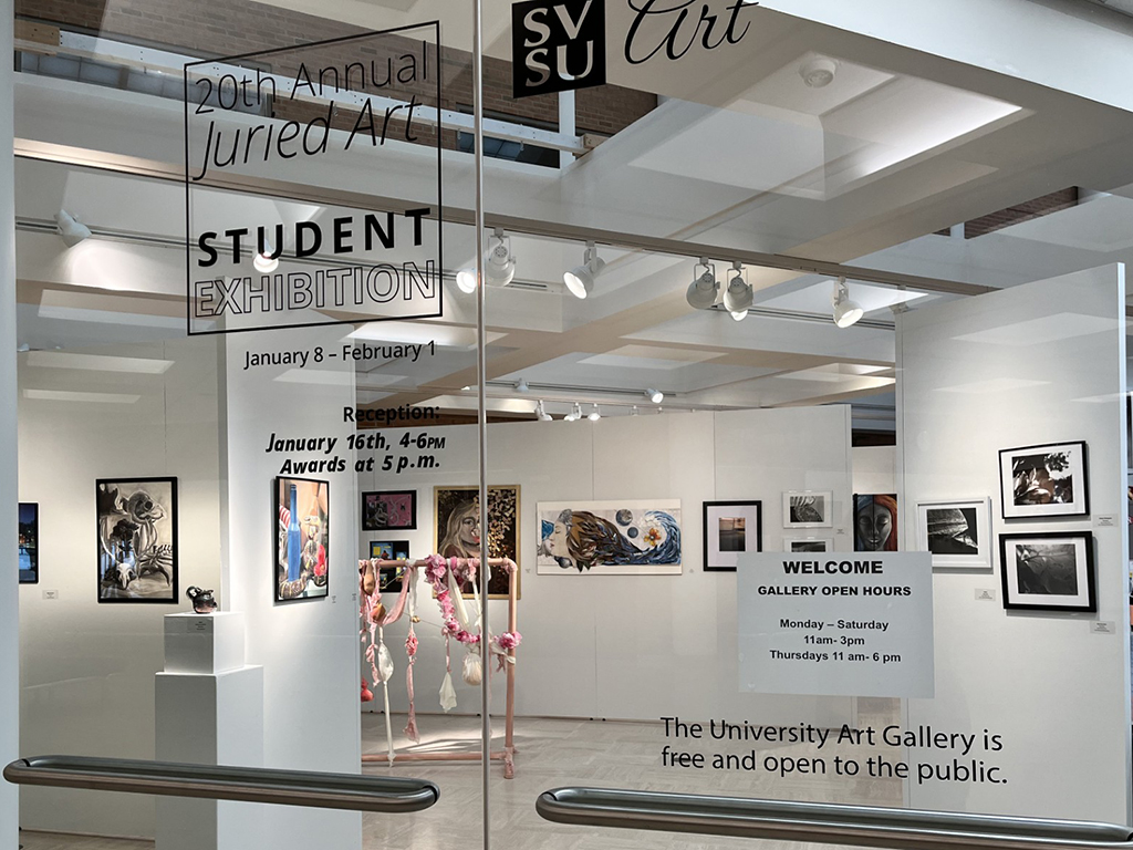 All gallery exhibitions, lectures and receptions are free and open to the public. Click the following link for open gallery hours or call (989) 964-2291. The University Art Gallery is located in the Arbury Fine Arts Center on the campus of Saginaw Valley State University, svsu.edu/go/visit/maps/.