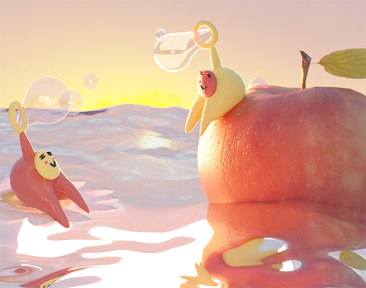 While sketching out ideas for this exhibition, LaBrake knew that he wanted to create something that seemed tangible despite being a purely digital creation. He found inspiration in the clay-modeling artists Yuka Morii and Wataru Yamaguchi, who are best known for their work with the Pokémon Trading Card Game and Nintendo, respectively. He wanted the final image to be friendly and whimsical, like something that would be seen in a children’s book. Logan modeled the characters and environment in a 3D software called Blender and created a texture for the main characters that imitated the indents and fingerprints found on modeling clay.