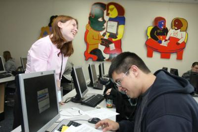 Mural panels were created by SVSU students David Young (BFA ’08) and James Zimmer III (BFA ’07) and presented to Bay City Central High School as a gift of the SVSU Writing Center. The colorful images celebrate students, teachers, writing, and mentoring.