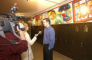 All of this was completed in the seven weeks of Summer semester. The Good Neighbors staff approved of the designs, Ron Hawkins said, "Yes, this is what's going on" and suddenly we had our title for the murals. The digital files were sent to the Detroit office of MetroMedia Technologies, an international billboard-printing corporation, and output on vinyl. Chris Schilling hired Terry Wolff to install plywood panels as backing for the 3' x 60' interior murals and track lighting to illuminate them, and professional paperhangers affixed them to the plywood.
