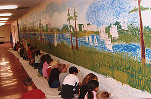 Joyce Bailey, an elementary school teacher working on more education credits, and Alisha Blomquist, an Art major, directed the kids at Linsday elementary in painting a history of Bay City. This riverfront history begins with the Bay City area before the city was established, then continues on through its past in lumbering and shipbuilding, up to aspects of modern day Bay City.