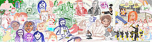 The "Finding the Center" digital mural project of completed during the winter semester of 2006 gave my art students an opportunity to draw high school students and Writing Center student mentors on February 25th, as well as to teach all these non-Art students art skills to create imagery for the mural for their greater involvement in the project. The four muralists--Erica Kowal, Howard McLean, Benjamin Robinson and Cole Swinehart—organized fifteen-minute mini-workshops for the entire group in figure drawing, caricature, "street" (graffiti-derived contemporary Pop Art) motifs, and watercolor painting. The fruits of these efforts were collected, scanned, assembled, and manipulated in Photoshop, and other images suggested in group discussion were drawn by the muralists. The resulting mural design was critiqued by the Writing Center, and necessary changes were made.