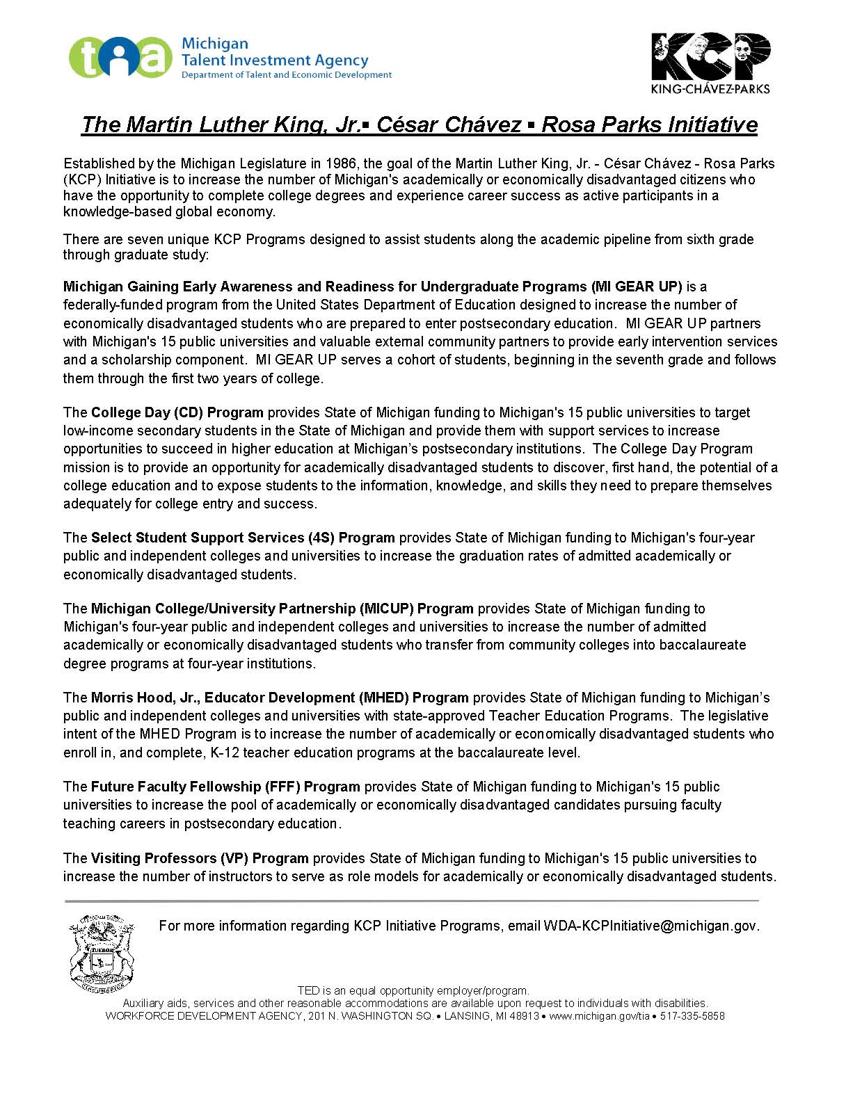| Established by the Michigan Legislature in 1986, the goal of the Martin Luther King, Jr. - César Chávez - Rosa Parks (KCP) Initiative is to increase the number of Michigan's academically or economically disadvantaged citizens who have the opportunity to complete college degrees and experience career success as active participants in a knowledge-based global economy. |