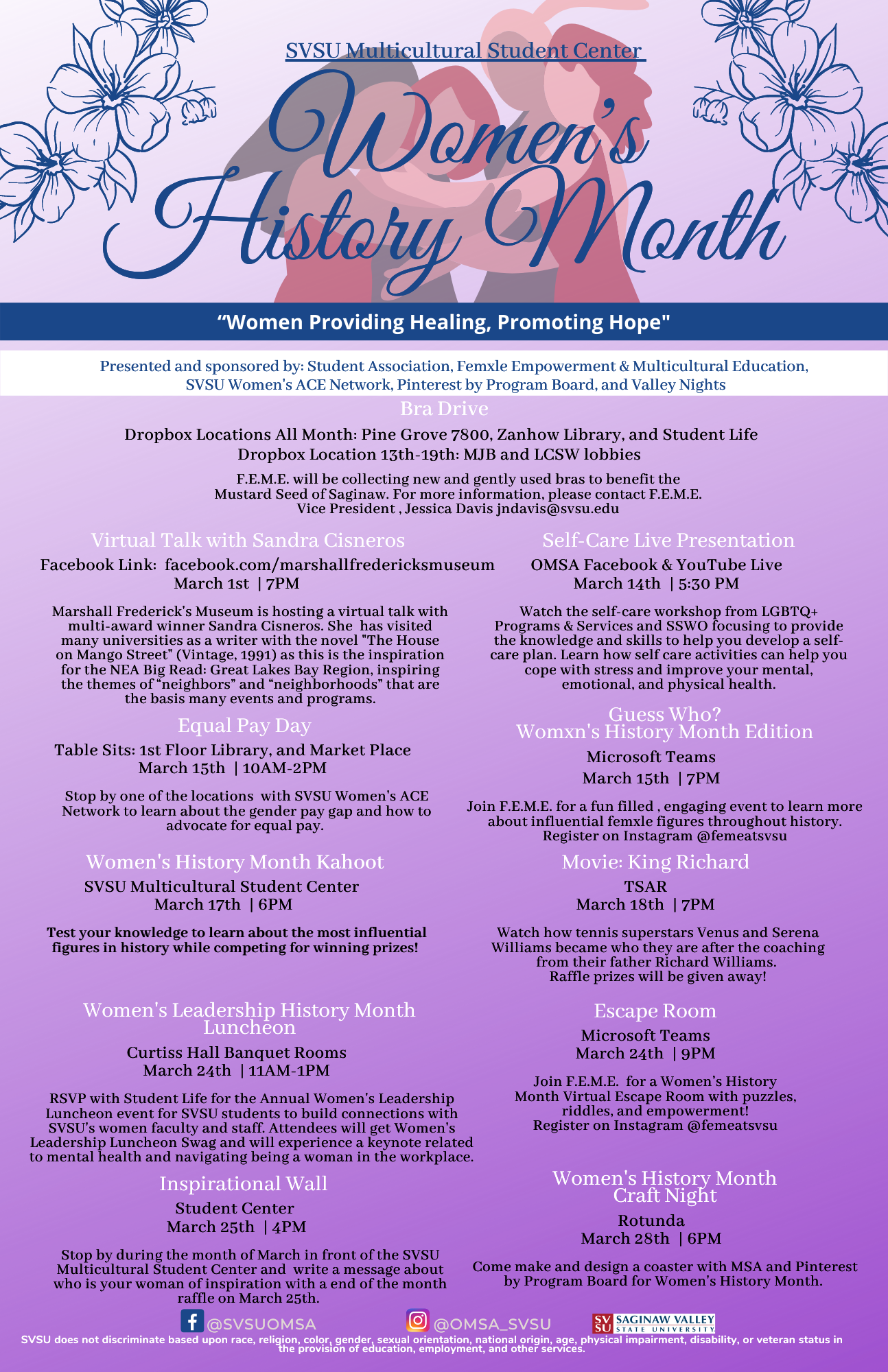 The Office of Multicultural Student Affairs aims to sponsor and host events that educate and bring awareness to the campus community on Women’s history, issues, and contributions through performances, speakers, exhibits, and discussions.