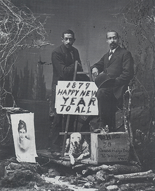 A black top hat balanced on his raised right leg, Wallace Goodridge rests his left forearm atop the same wooden easel where his brother, William Goodridge, is perched in a similar pose, inches away. Together, in the Saginaw photo studio they own, the siblings stare forward at the camera. Each awaits the telltale signs that indicate a photograph has been taken. Prop foliage surrounds them. A canvas in the background portrays a painted wooded landscape. A Dalmatian rests lazily at their feet. The easel between the brothers hoists a sign, and it bears a message: