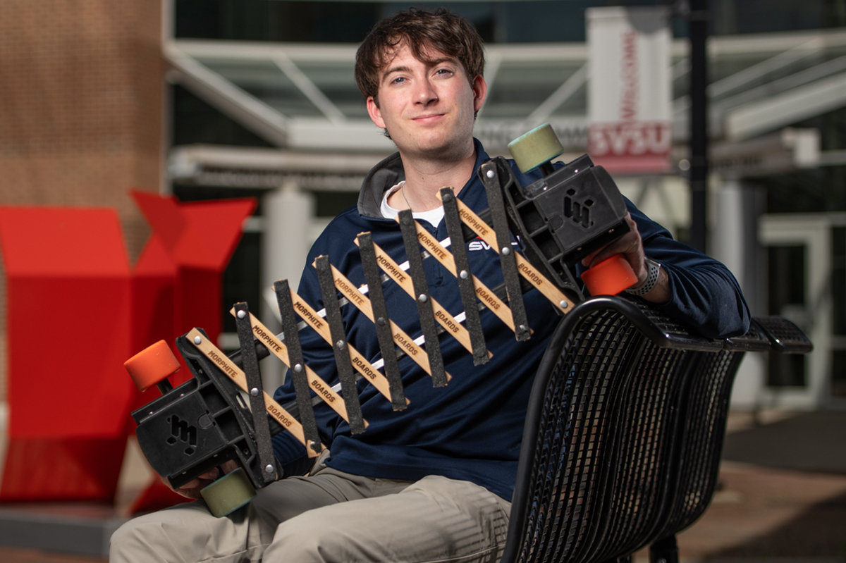 Ryan Pelletier, an international business major from Midland, has built his brand, Morphite Boards, from the ground up at SVSU. Pelletier has filed a patent on his newly designed longboard, which collapses for improved portability.
