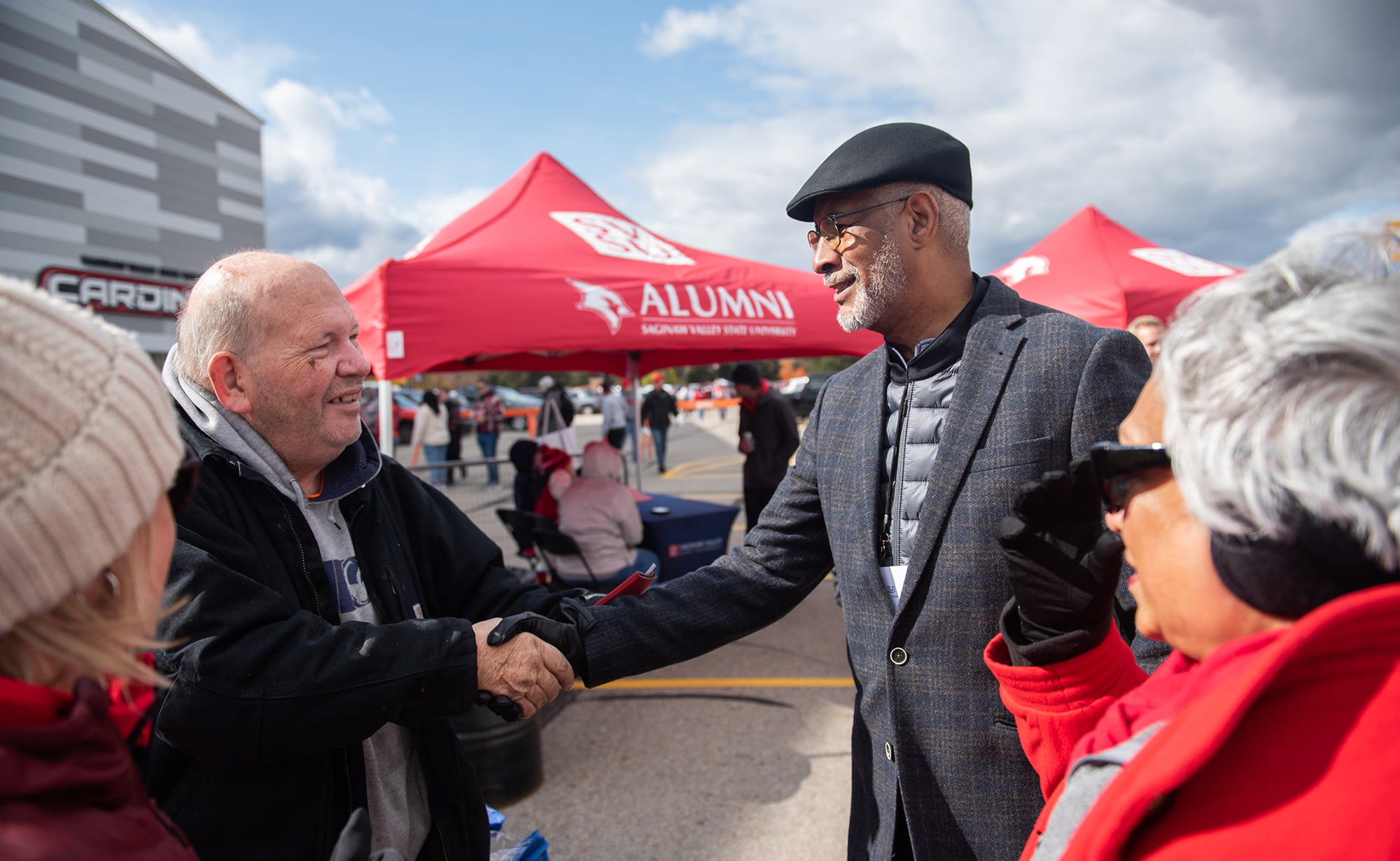 President Bachand welcomed his successor, George Grant Jr, to campus to make introductions and continue progress on the presidential transition. Their time together included a visit with SVSU’s enthusiastic students, who donated more than 800 lbs. of food to the Cardinal Food Pantry as part of a Homecoming service project. Several faculty and staff had the opportunity to offer a friendly hello.