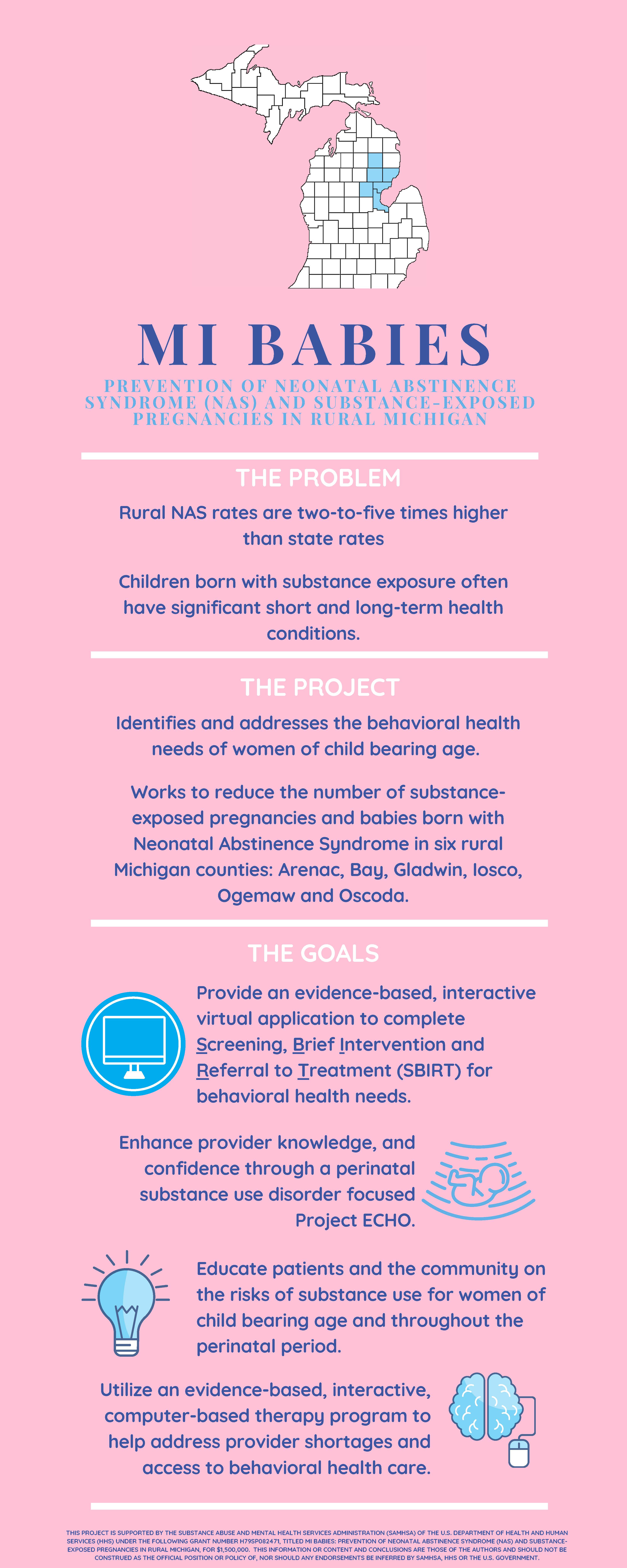 Nationally, the incidence rate of neonatal abstinence syndrome (NAS) has increased 5-fold from 2004 to 2014. Yet during that same period, Michigan experienced an 8-fold increase. Michigan rural communities face a higher incidence rate of NAS, far outpacing their urban counterparts. Although we have higher incidence rates for NAS in our rural communities, pregnant women with substance use disorders face major barriers to screening and treatment. Through the Center for Rural Behavioral Health & Addiction Studies, MI Babies Project and our rural partners with support from the Substance Abuse and Mental Health Services Administration (SAMHSA) we are bringing innovative provider education and alternative prevention and treatment opportunities to our partners in rural Michigan.