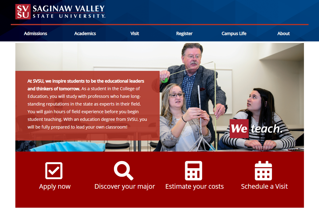SVSU.edu is an essential marketing media and academic resource of the university. Its mission is to serve as the virtual gateway to the university and advance the mission, brand and reputation through dynamic, actionable and accessible content. The main intended audience for svsu.edu is an external one. Therefore, it focuses primarily on reaching prospective students, parents, and other populations seen as “external” to the institution. We strive to deliver messages and content to a primarily off-campus audience with a strong focus on marketing.